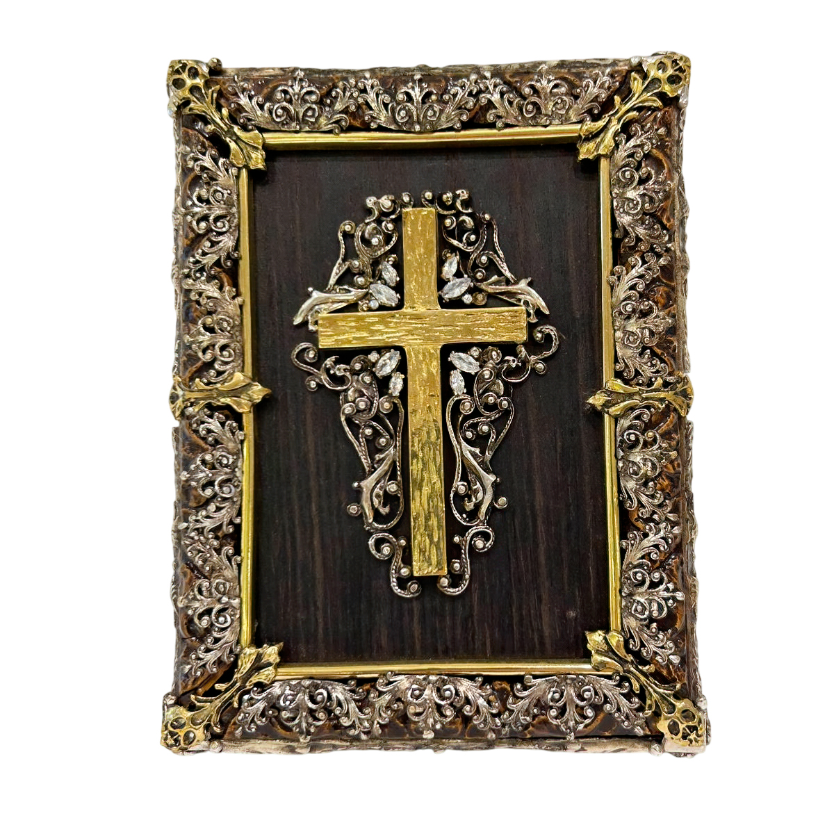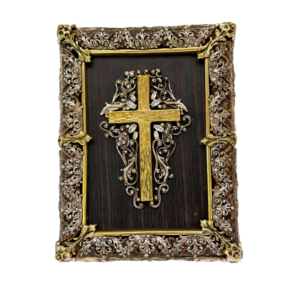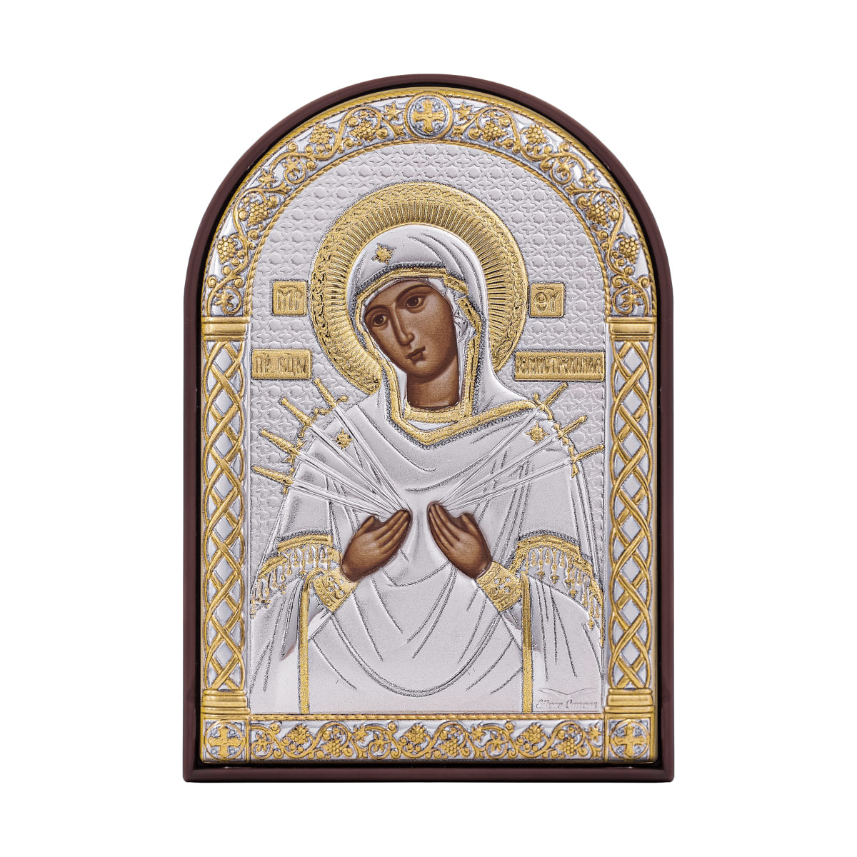 Размеры иконы составляют 17 см в высоту и 12,5 см в ширину, что делает ее идеальной для размещения в домашнем интерьере или церковном помещении. Ее можно поставить на полку или повесить на стену. Высокая детализация, контрастные золотые и черные элементы оформления, а также использование металлических элементов в рамке придают иконе уникальный вид.