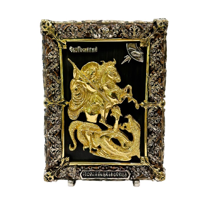 Икона Георгий Победоносец от торговой марки Голд Кэпитал - это уникальное произведение искусства, созданное в России. Изображение святого Георгия, сражающегося с драконом, символизирует победу добра над злом и духовную силу.