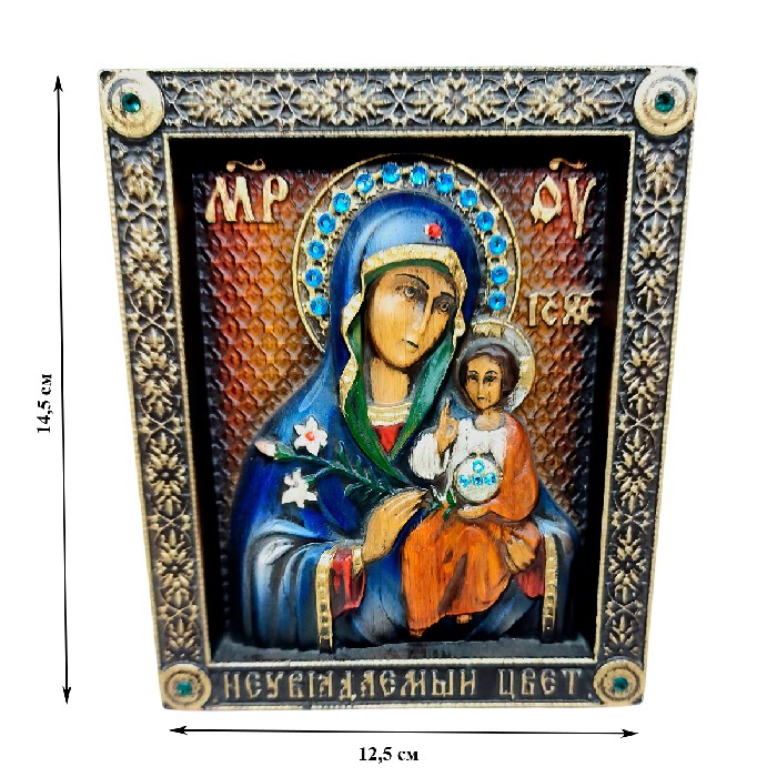 Икона «Неувядаемый Цвет» от торговой марки Резное Изделие — это изящное произведение православного искусства, выполненное вручную из натурального дерева. Размер иконы составляет 12,5х15 см, что делает её удобной для размещения как в доме, так и в качестве подарка.