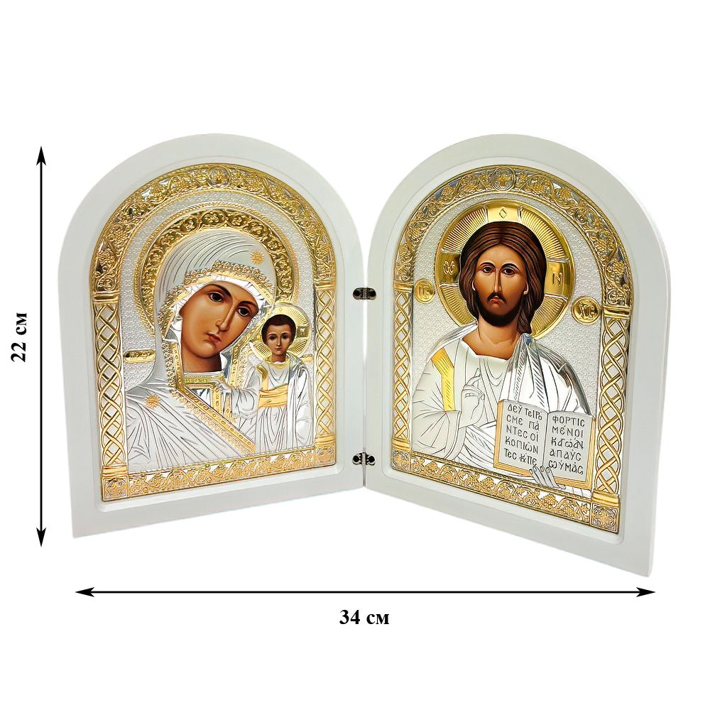 Складная икона AGIO SILVER - изящное и благородное изделие российского производства, выполненное в традиционном православном стиле. Высота композиции составляет 22 см, общая ширина в разложенном виде - 34 см (17 см в сложенном). Икона состоит из двух створок: на левой изображён образ Казанской Божией Матери с Младенцем, на правой - Спаситель.