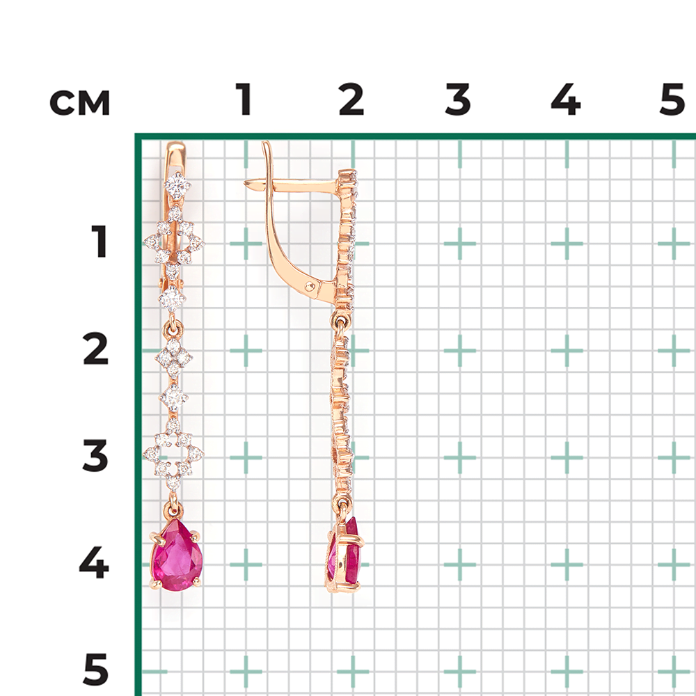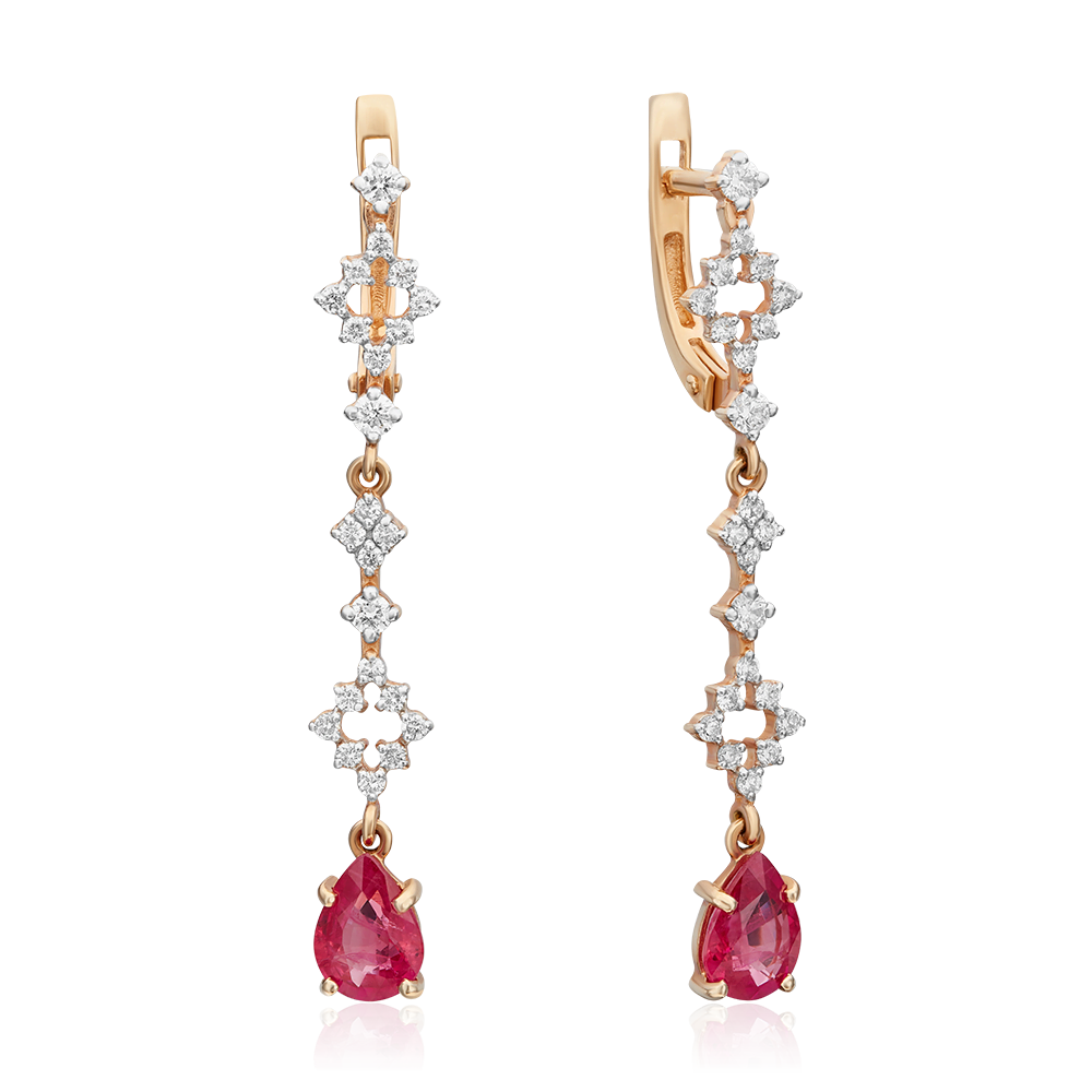 Выбираете украшение для собственной коллекции или хотите сделать роскошный подарок? Серьги покоряют с первого взгляда. Дизайнеры продумали каждую деталь: золото 585 пробы красиво блестит как в искусственном, так и в естественном свете, а вставка (рубин: 2 шт. груша 2/2, вес 1.56, бриллиант: 40 шт. 57 круглая 4/4 а, вес 0.3, бриллиант: 6 шт. 57 круглая 3/5 а, вес 0.18) играет собственными гранями, дополняя визуальный эффект. Общий вес изделия — 2.95, смотрится очень аккуратно, но при этом выразительно и стильно. Серьги можно носить с разными образами, и в любом вы будете сиять и привлекать восхищенные взгляды. Мы уверены, что всегда найдется повод надеть это великолепное украшение.